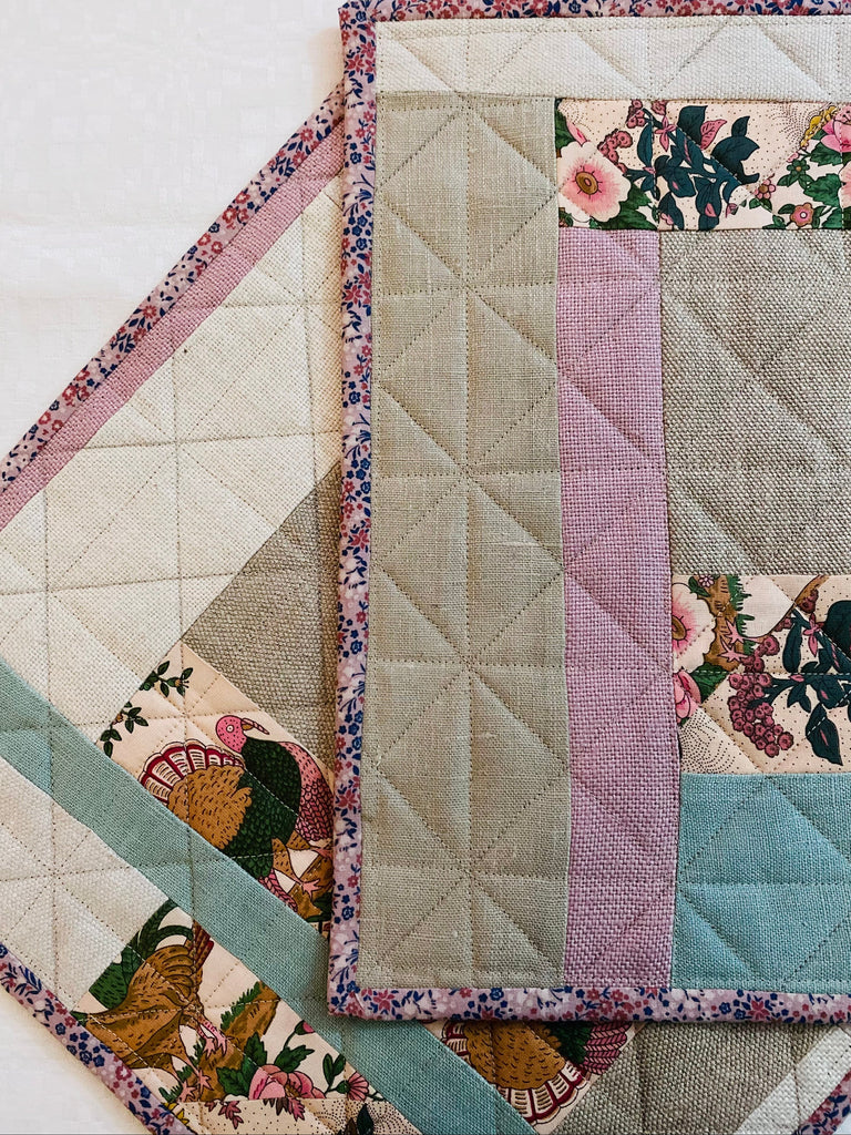 Conjunto de 2 individuais compostos por retalhos de de chita, provenientes de reciclagem de restos de outros trabalhos da coleção "Alcobaça".